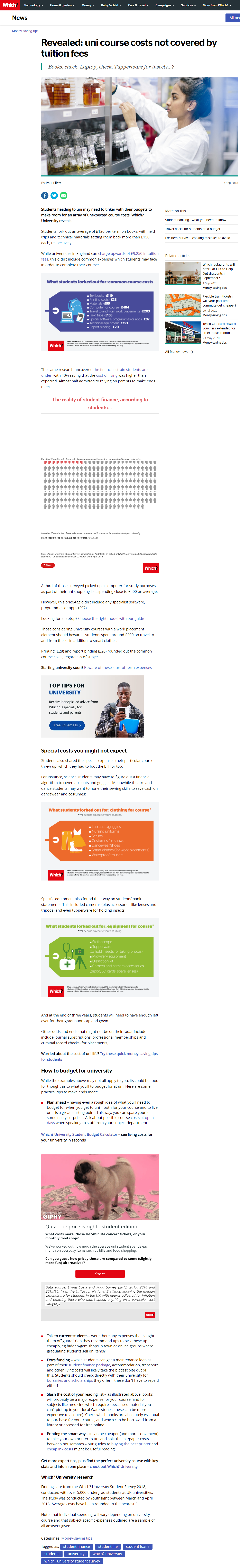 A news story for the main Which? website, highlighting a recent piece of student research on university costs which students may not be prepared for.