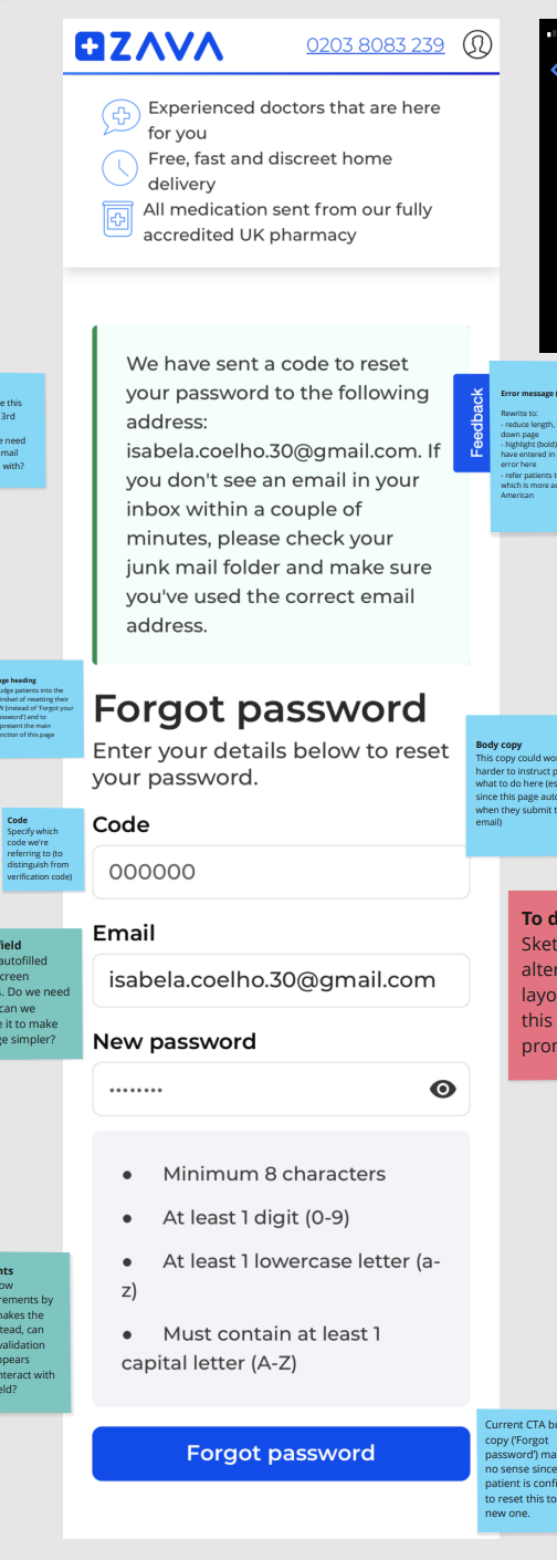 The UX Lead also asked for my thoughts on further improvements that would require UX/Product work. For more significant changes like removing fields or elements, I created very rough, mid-fidelity prototypes in Figma to illustrate my ideas. See password reset page example below, showing the original and prototype screens.